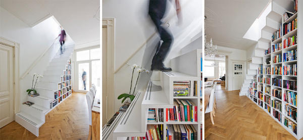 位于荷蘭阿姆斯特丹的marc koehler architects利用樓梯一層層的規(guī)則,分割出大小一致的方格,把樓梯下的三角空間充分利用成書(shū)架,不但可以收納更多書(shū)籍,而且剛好在餐桌前,面對(duì)一整面書(shū)墻用餐,不比盯著電視差喔。