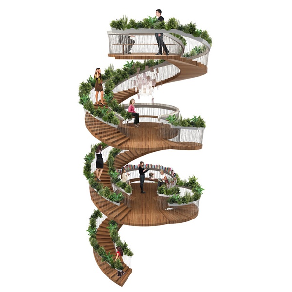 樓梯不僅僅是個(gè)過渡區(qū)域,還可以兼?zhèn)淦渌δ埽热缈罩谢▓@。在倫敦的一處辦公區(qū)域里,設(shè)計(jì)師把承重柱在中間的傳統(tǒng)樓梯變成螺旋結(jié)構(gòu)的The Living Staircase,沿著欄桿種滿植物,還設(shè)有圓形平臺(tái),成為可以讓上班族在此休息放松的公共區(qū)域。設(shè)計(jì)源自 Paul Cocksedge Studio。